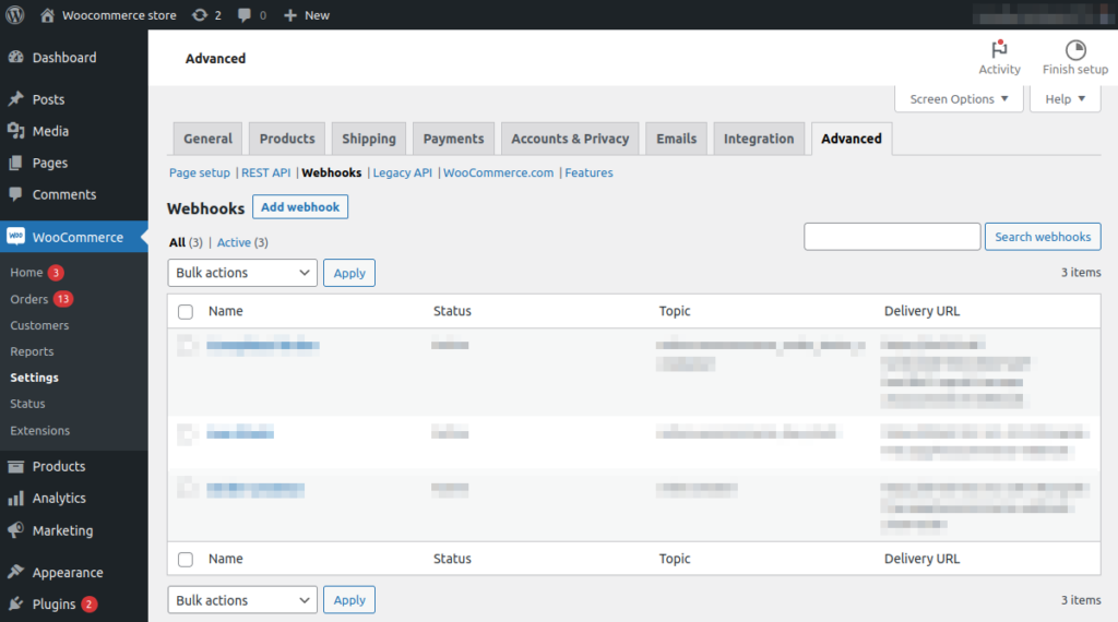 5. 在 WordPress 管理仪表板上,选择WooCommerce > Settings > Advanced > Webhooks。