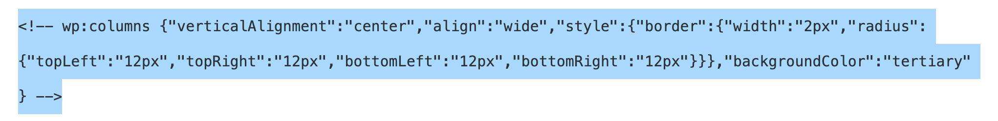 $template = array( 'core/columns', array( 'verticalAlignment' => 'center', 'align' => 'wide', 'style' => array( 'border' => array( 'width' => '2px', 'radius' => array( 'topLeft' => '12px', 'topRight' => '12px', 'bottomLeft' => '12px', 'bottomRight' => '12px' ) ) ), 'backgroundColor' => 'tertiary' ), array( array( 'core/column' ), array( 'core/column' ) ) );