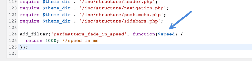 在文件底部输入 PHP 代码。在本例中,我还是将从 Perfmatters 插件中添加一个过滤器,以改变懒加载时的渐变速度。
