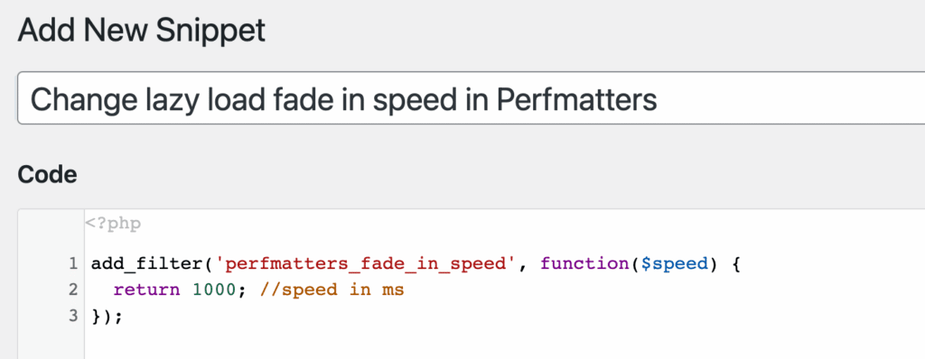 添加代码片段的名称,可以是任何你想要的名称。然后添加 PHP 代码段。在本例中,我将从 Perfmatters 插件中添加一个过滤器,以改变懒加载时的淡入速度。