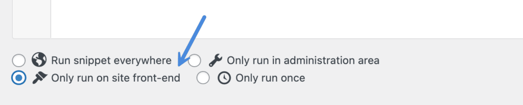 选择代码片段的运行位置。在本例中,我只需要它在网站前端运行。不过对于大多数 PHP 代码片段来说,你可能需要它在所有地方运行。