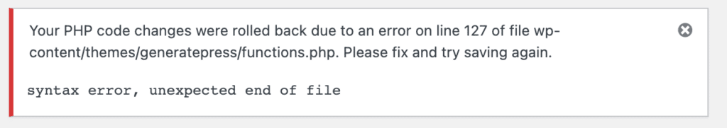 好消息是,WordPress 的新版本已经内置了一些保护措施。下面是一个例子。我忘了关闭一个语句,更新文件后,当它检测到这个问题时就回滚了更改。这样就避免了 WordPress 网站崩溃。在以前,这种情况会导致白屏死机。