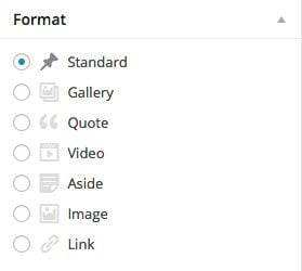 激活子主题后,您可以访问 WordPress 管理并创建一个新文章。你会看到右侧边栏列出了六种文章格式。选择其中任何一种,就可以将文章改为特定的文章格式,或者直接保留为 “标准 “格式。在我们继续之前,我建议您为每种文章格式添加几个包含相关内容(图库、嵌入式视频等)的虚拟文章,这样您就可以看到文章格式的实际效果。
