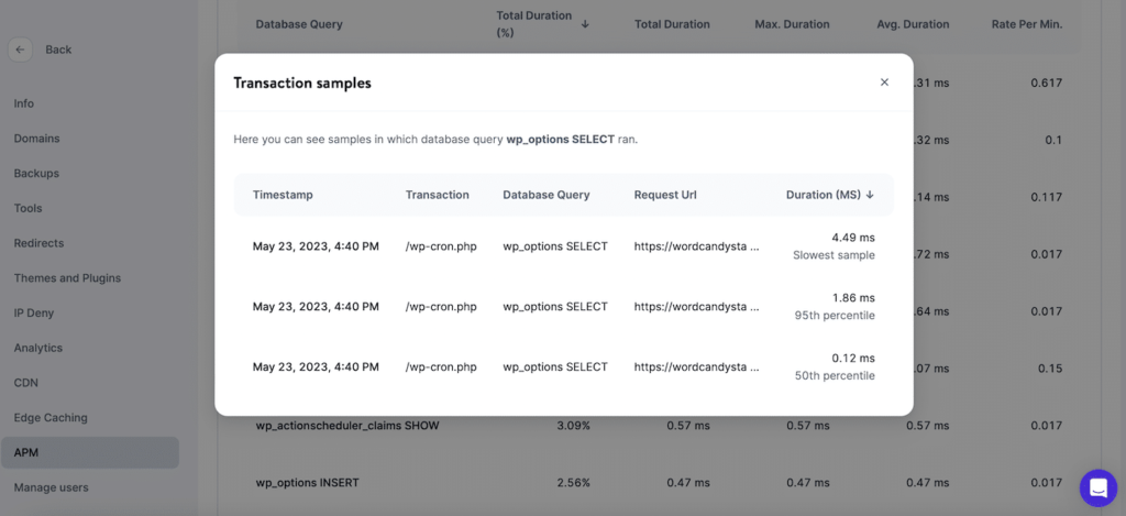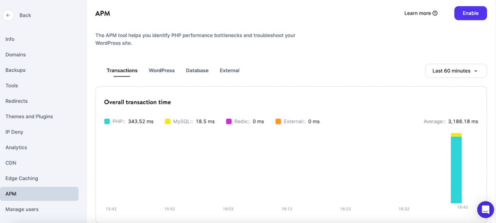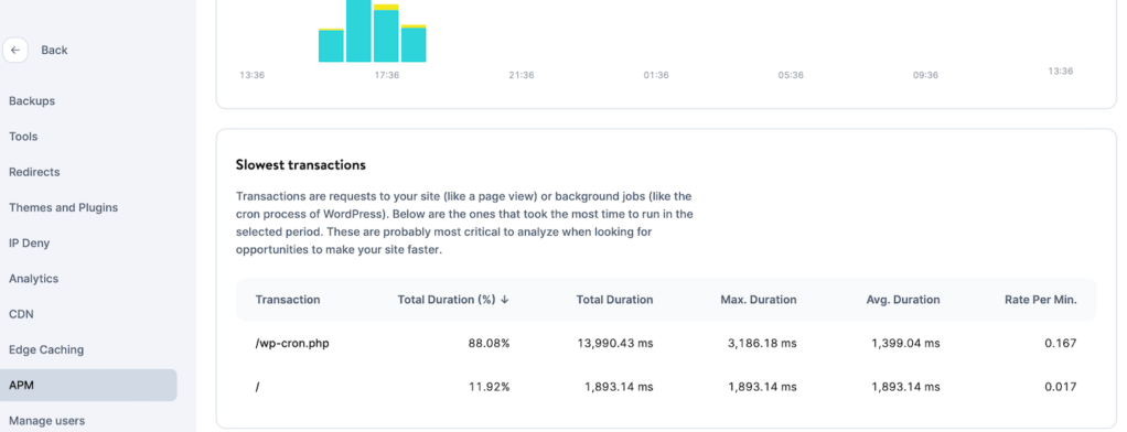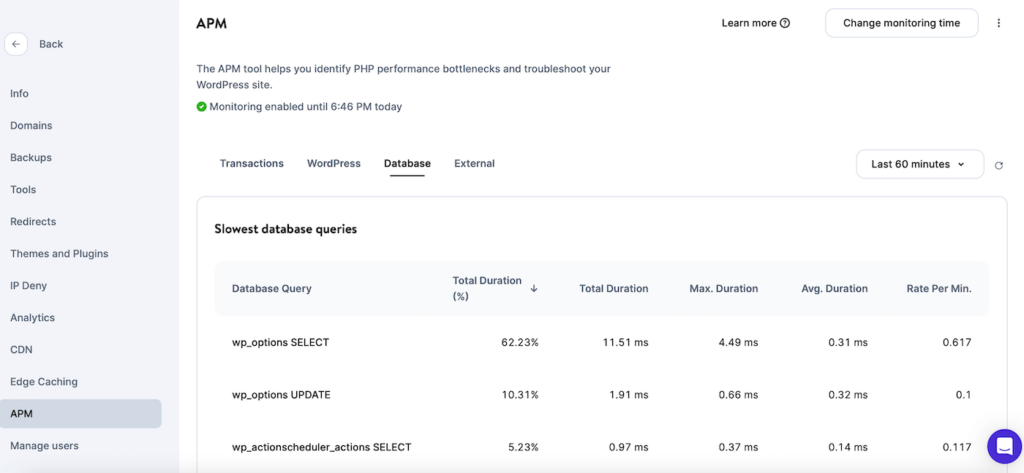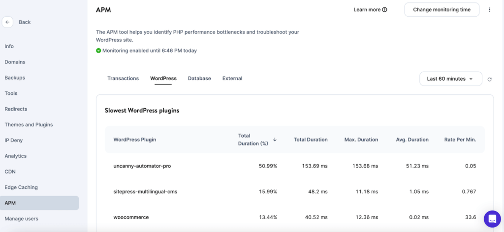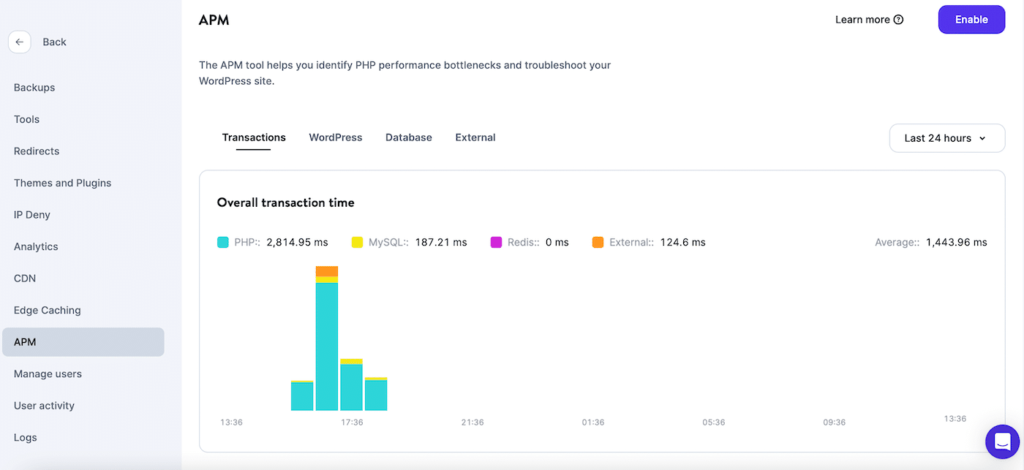 识别慢速查询和脚本的最简单方法是启用Kinsta APM。如果你是Kinsta的客户,你可以免费使用这个工具。不过,你需要在你的MyKinsta仪表盘上启用它。