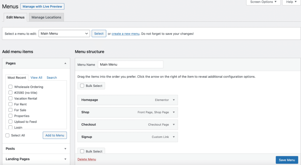 你也可以点击屏幕顶部的管理与实时预览,看看你的菜单是如何形成的: