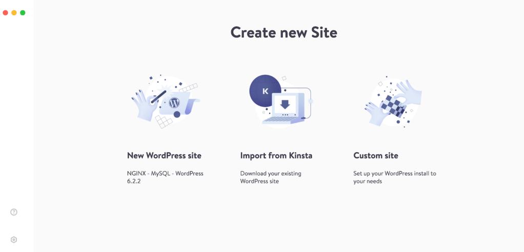 一旦你成功安装了DevKinsta和Docker,你就可以创建你的本地站点。你可以创建一个新的WordPress网站,从Kinsta导入一个现有的网站,或者建立一个自定义的网站: