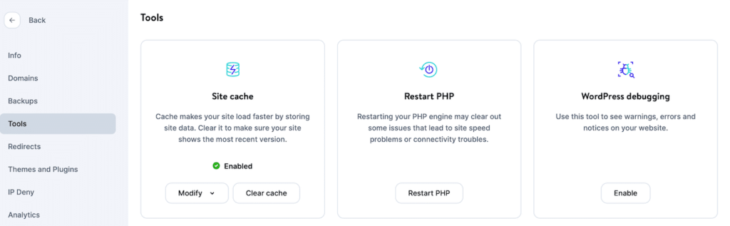 在你的MyKinsta仪表板上,点击WordPress Sites,选择你的网站。然后,导航到Tools,在Site cache下,点击Enable: