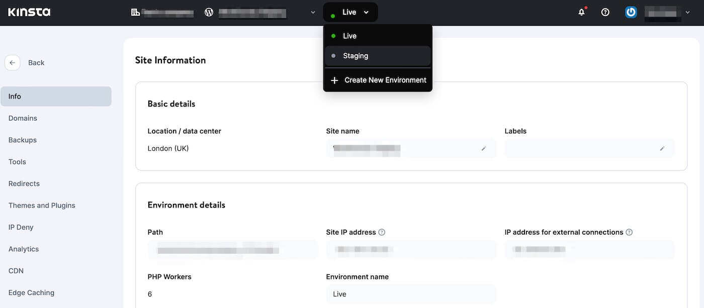 你可以通过登录你的MyKinsta仪表盘访问你的暂存网站。只需从列表中选择你的网站。然后,在屏幕的顶部,使用下拉菜单,将Live改为Staging: