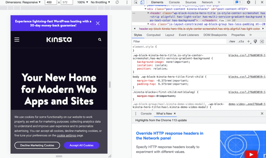 要测试你的CDN,最简单的方法是使用网站速度测试工具。但首先,检查静态资产的HTTP头是一个好主意,以确保它是从Kinsta CDN加载的。