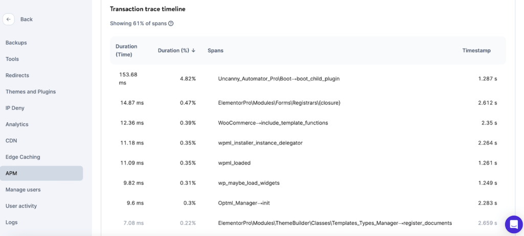 考虑到这一点,开始使用Kinsta APM可能会有帮助。通过我们的应用性能监控工具,可以很容易地发现WordPress的性能问题: