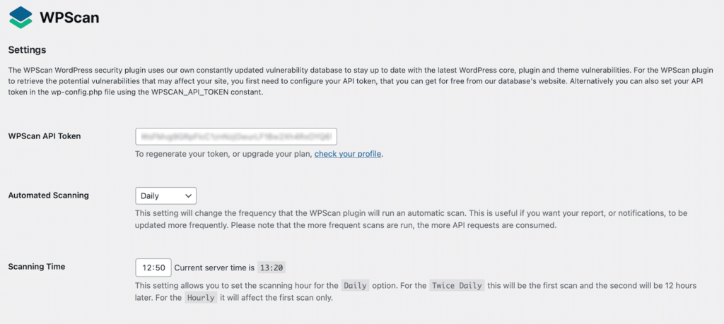 一旦扫描器被链接到你的网站,导航到WPScan > Settings,你可以设置每天或每小时的自动扫描: