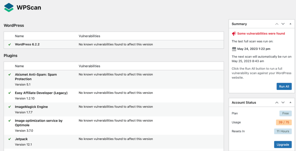 在这里,你可以看到你网站上所有插件的完整列表。如果你的插件是安全的,你会看到每个插件名称旁边有一个复选标记。否则,你会发现在Vulnerabilities栏中列出一些信息。