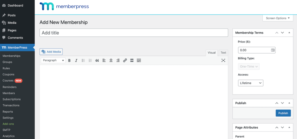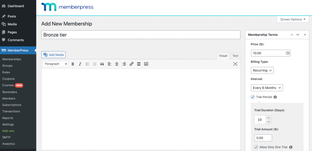 接下来,是时候创建你的会员级别了。这可以是一个授予访问所有内容的单一会员资格,或多个级别。在你的仪表板上,导航到MemberPress > Memberships > Add New。