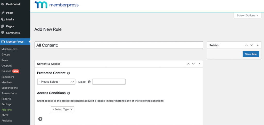 下一步是定义每个会员级别可以访问哪些内容。这需要你创建规则,所以导航到MemberPress > Rules > Add New。