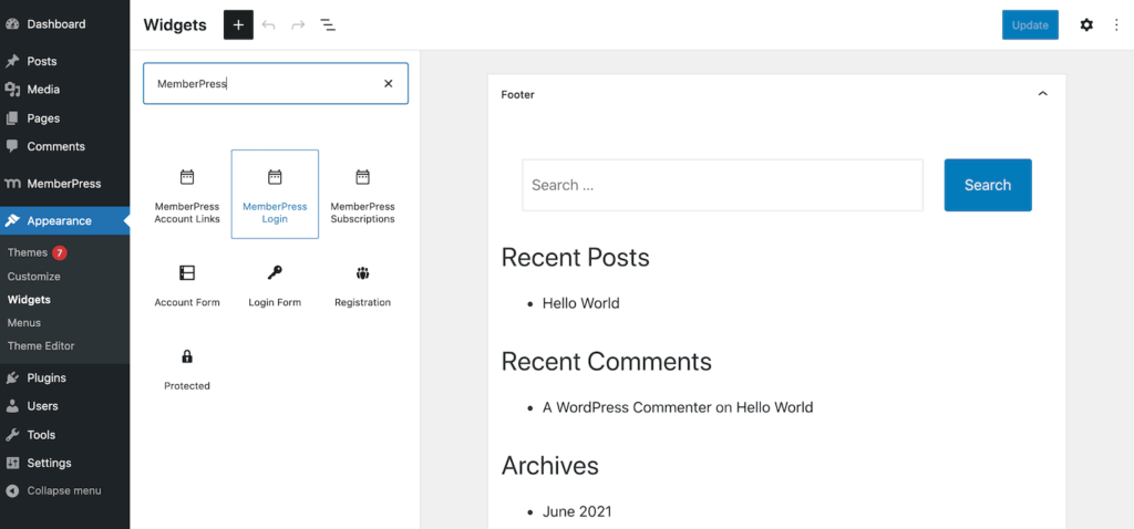 MemberPress为您提供了通过小部件添加用户登录表的选项。这非常适合将此表格添加到您网站的重复元素中,如页脚或侧边栏。