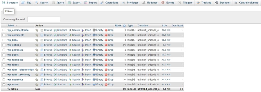 现在您可以单击屏幕顶部的“Databases”选项卡。在列表中找到您网站的数据库以查看其中包含的表: