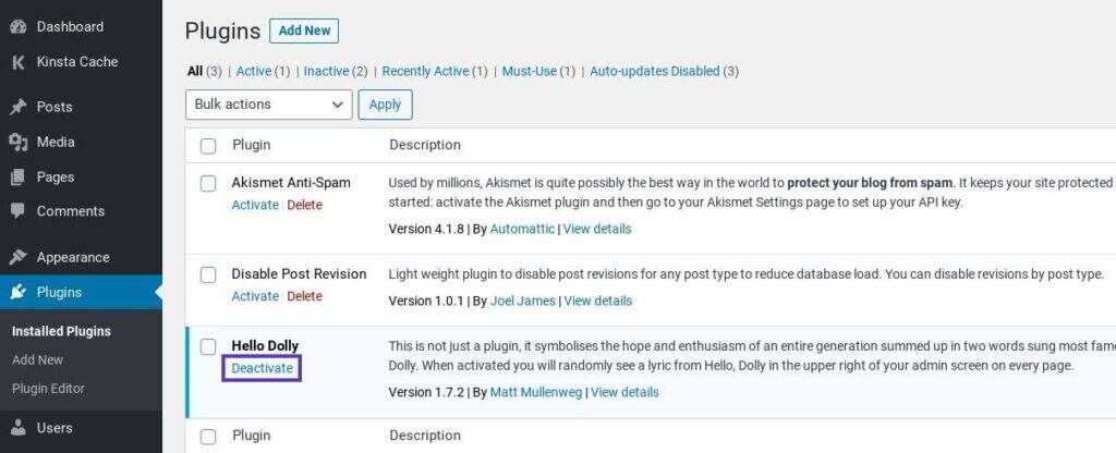 可以从本地站点的管理仪表板停用插件。为此,在屏幕左侧的菜单中,单击Plugins > Installed Plugins。要停用一个,请单击 插件名称下的禁用链接: