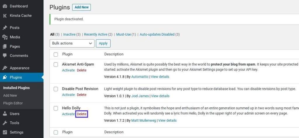 如果您想完全卸载插件,您可以从同一屏幕执行此操作。首先,停用插件,然后点击插件名称下方的红色删除链接: