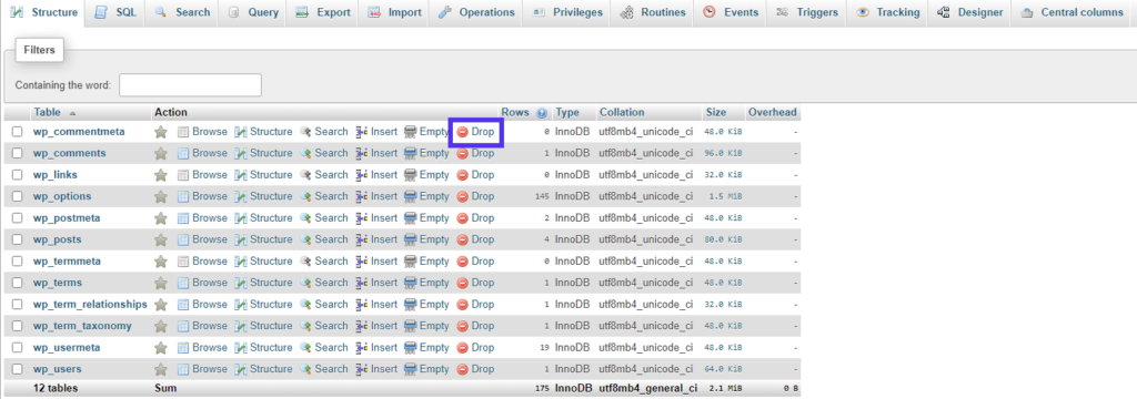 接下来,您需要梳理数据库并查找不应该存在的任何内容。一些插件会将全新的表添加到您的数据库中。要删除不必要的表,请单击其右侧的Drop 链接: