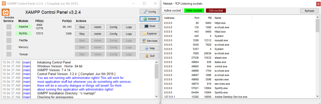Apache默认使用端口80,但如果您已经在该端口上侦听了某些内容,则可能需要更改它。要查找空闲端口,您可以单击XAMPP控制面板中的Netstat按钮: