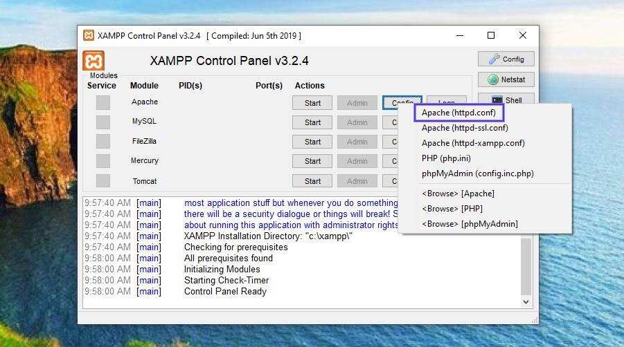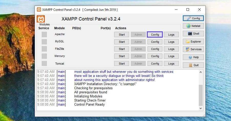 由于此错误与Apache有关,因此我们将重点关注这些设置。在“Apache” 选项行中,单击“ Config”按钮。