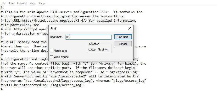 一旦文件在文本编辑器中打开,下一步就是更新端口设置。为此,您可以按Ctrl + F,然后在搜索字段中输入“80”。这将显示数字80的实例: