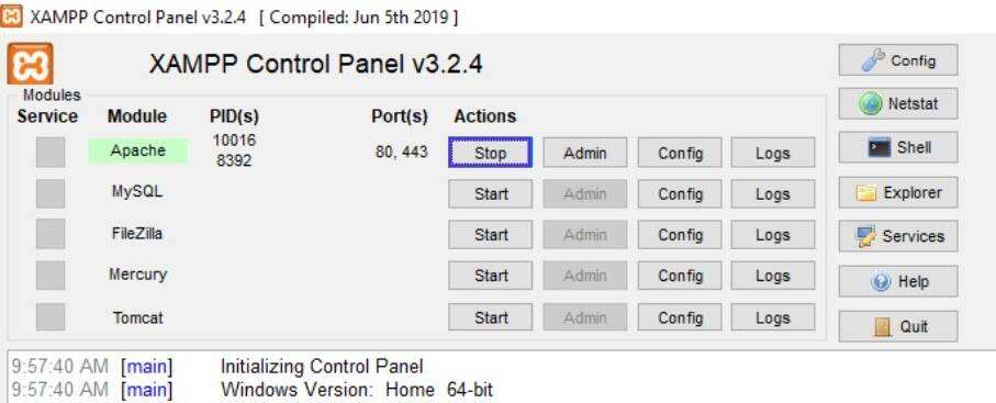 更新两个文件中的设置后,最后一步是停止Apache。您可以通过单击同一Apache行上的Stop按钮来执行此操作。Apache停止后,单击“ Start”按钮完成重新启动过程。