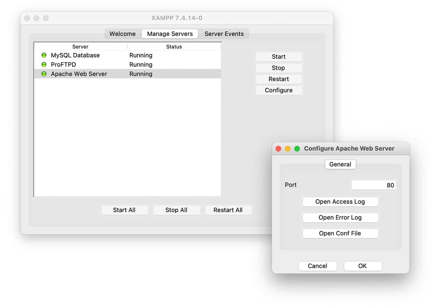 最后一步是停止并重新启动Apache,您可以从XAMPP应用程序管理器的Manage Servers 选项卡中执行此操作。Apache停止后,单击Start重新启动: