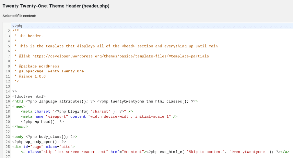 举个例子,这里快速浏览一下WordPress官方二〇二一主题使用的header.php模板文件: