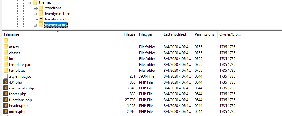正如我们所提到的,每个WordPress主题都包含自己的一组模板文件。您可以通过文件传输协议 (FTP) 客户端访问网站根目录中的文件夹来查看您的主题包含哪些模板文件。