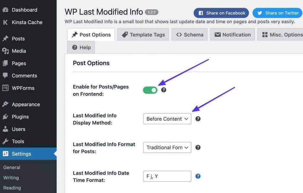 激活后,转到WordPress仪表盘中的设置 > WP Last Modified Info。在“Post Options”页面上,打开“Enable for Posts/Pages on Frontend”开关。