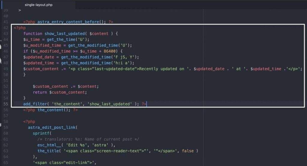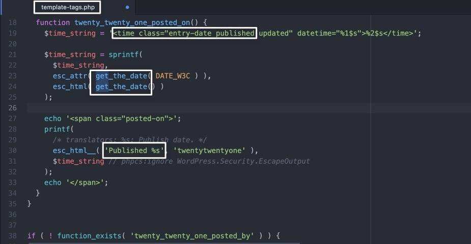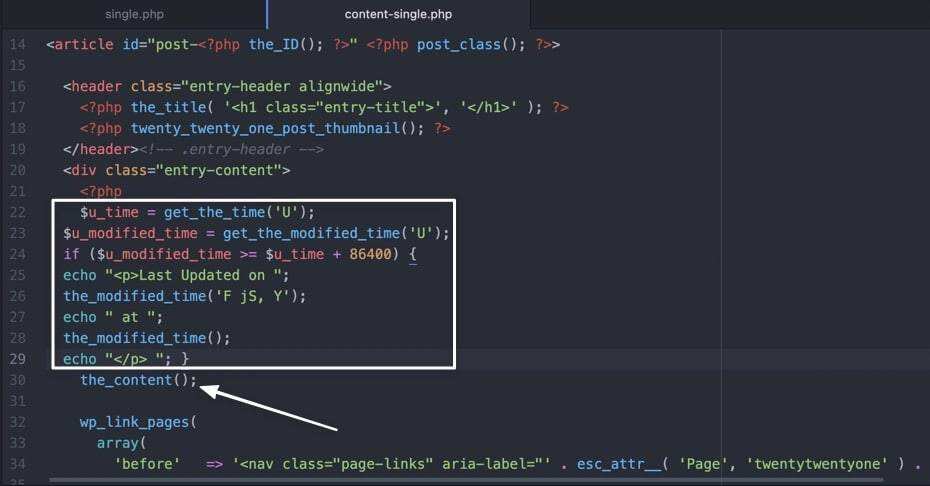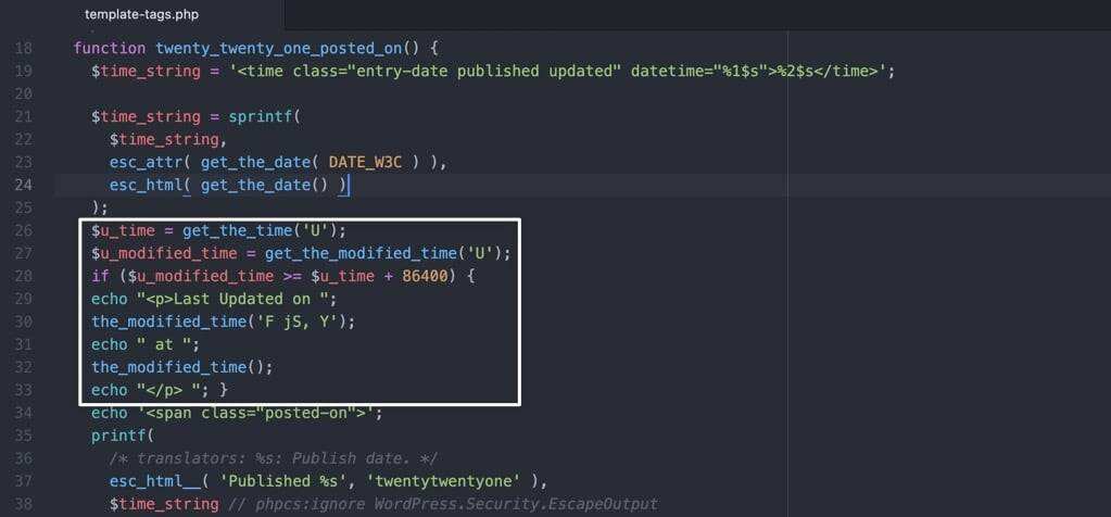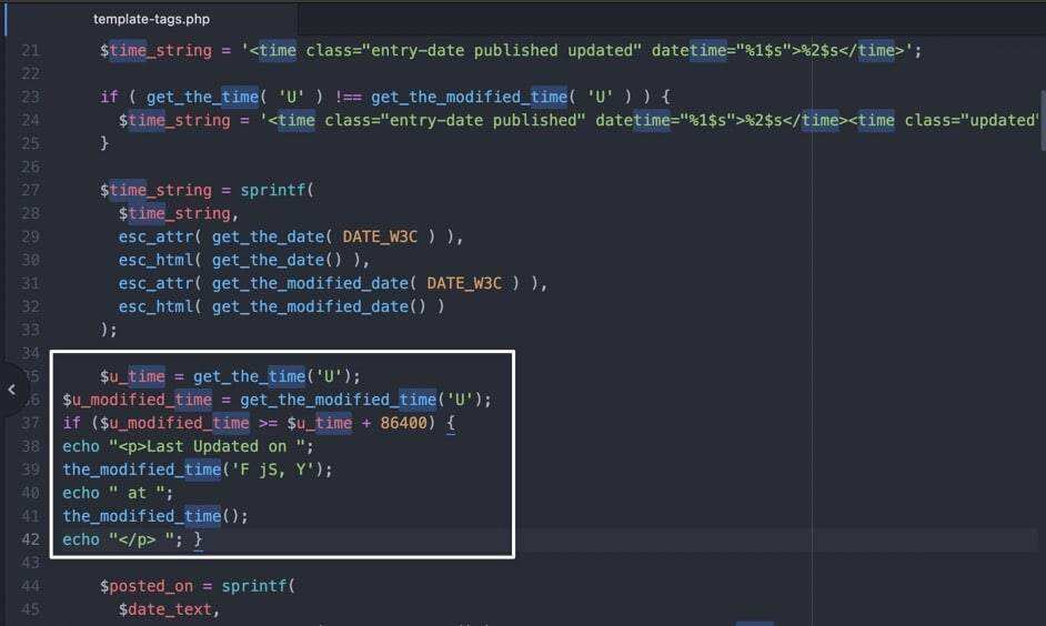 如果您发现自己处于这种情况,可能是因为您的主题。一些WordPress主题会自动删除页面的最后更新和发布日期,因为它们没有理由。但是您最终可能会得到一个没有这些功能的主题。在这种情况下,您只需要对先前实现的PHP代码进行简单的添加。