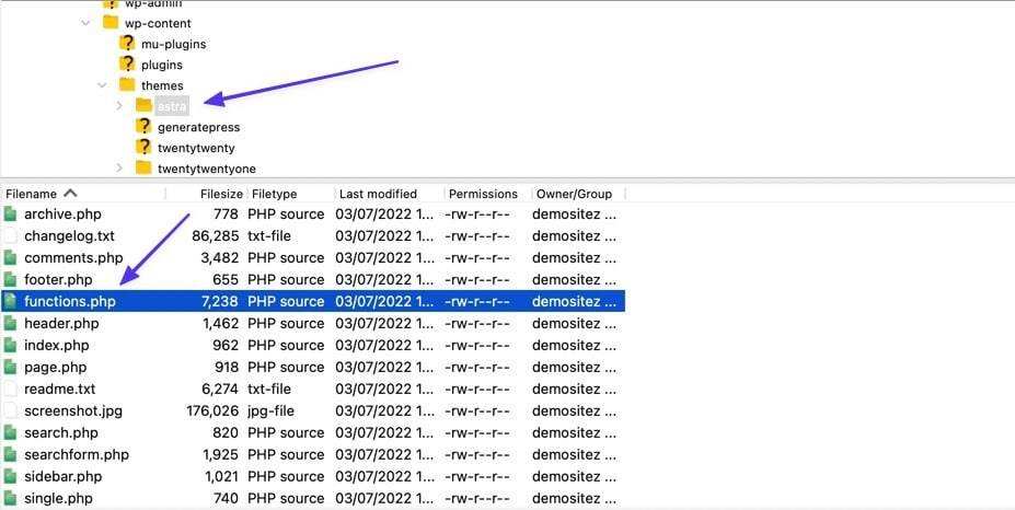为了让您了解每个主题的工作方式有何不同,默认情况下,Astra主题(及其Travel Blog入门模板)甚至不显示发布日期。无论如何,您仍然可以添加最后更新的日期。要使用本文中的方法 1 插入日期,请在您的FTP客户端转到/wp-content > /themes > /astra。打开functions.php文件。