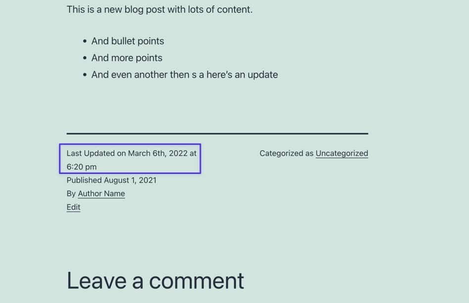 - 它为搜索引擎提供了另一种将文章识别为新鲜的方式。 搜索引擎当然会抓取内容;但这并不总是发生,“最近更新”日期会加强您网站上所做的任何更改。