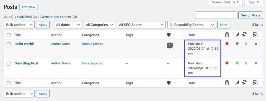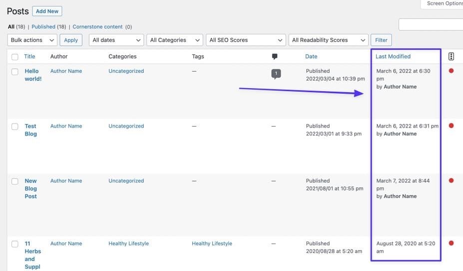 不幸的是,当您添加到您的文章和页面时,WordPress不会在后端自动显示修改或上次更新日期,即使您从我们上面的方法中实现了一些代码也是如此。转到WordPress中的文章列表仅显示发布日期列。