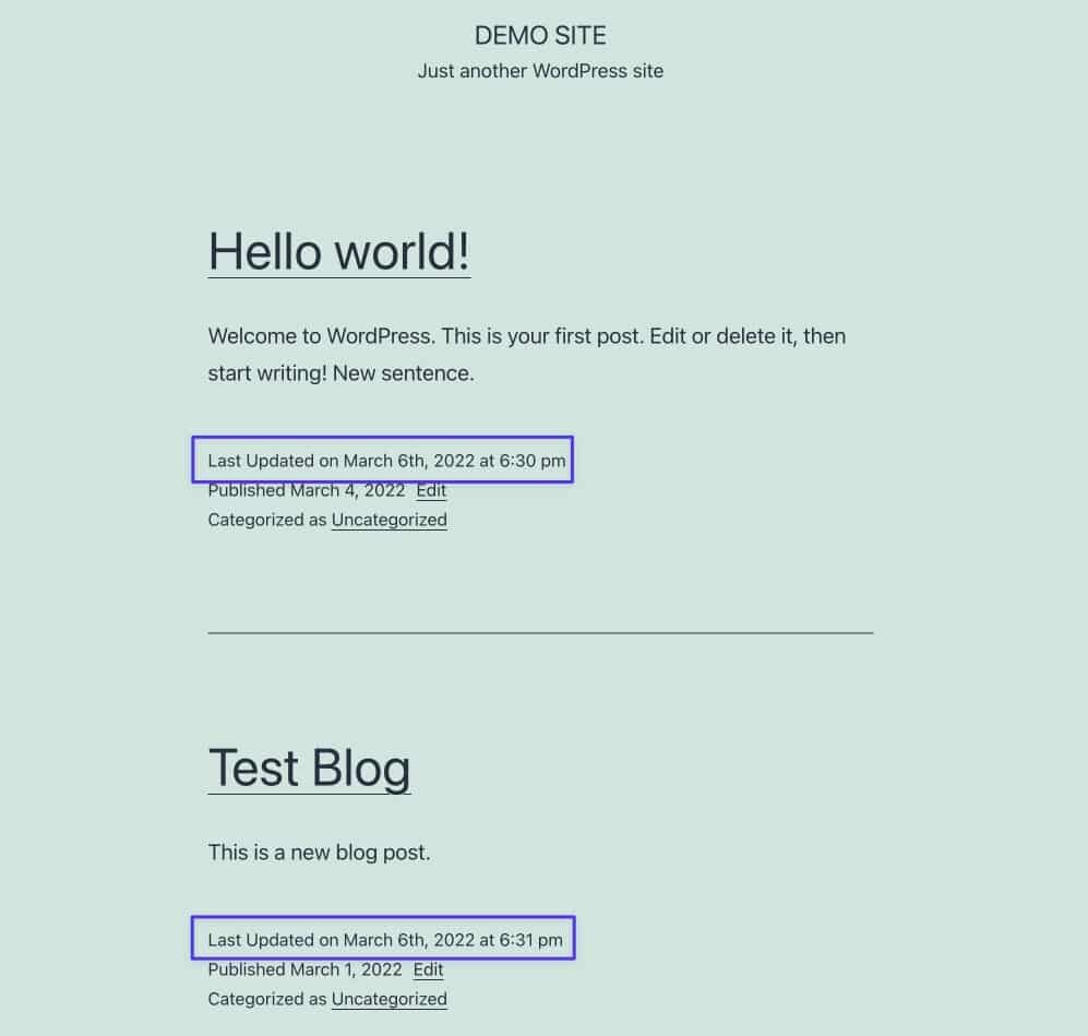 您可能已经在本文中多次注意到,每个主题都有自己的内置样式、CSS代码和PHP功能。因此,不可能说出每个主题如何响应我们的示例代码。此外,许多主题已经具有适当的样式,甚至显示上次更新日期而无需您进行任何调整。