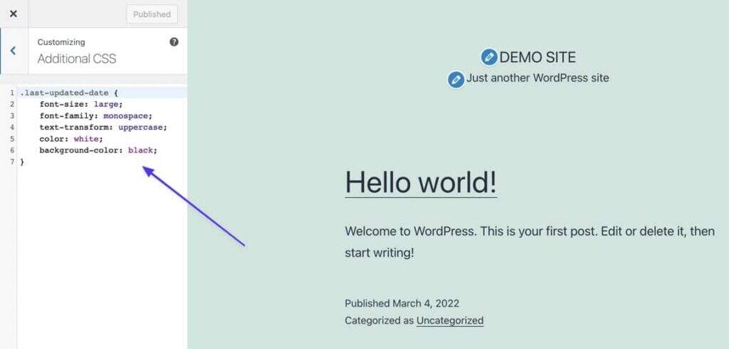 请注意,我们正在使用与插入到functions.php中的PHP代码last-updated-date相关的类 。您可以根据自己的目的更改它,但请确保您在CSS代码中也使用相同的类。
