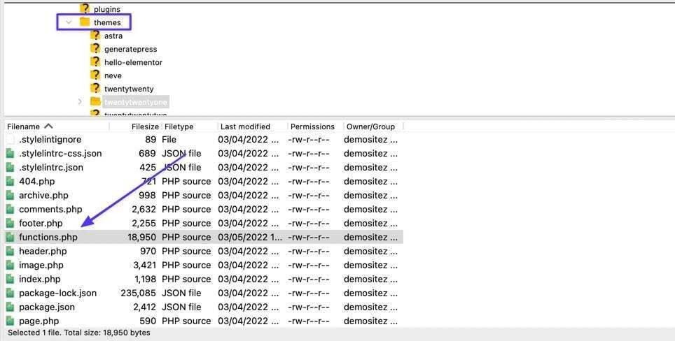 首先,转到主题的functions.php文件。访问functions.php的最简单方法是使用FTP客户端连接SFTP。您通常可以通过FTP客户端转到 /www (或者您的网站域名) > /public > /wp-content > /themes > /theme-name (本教程是 /twentytwentyone).