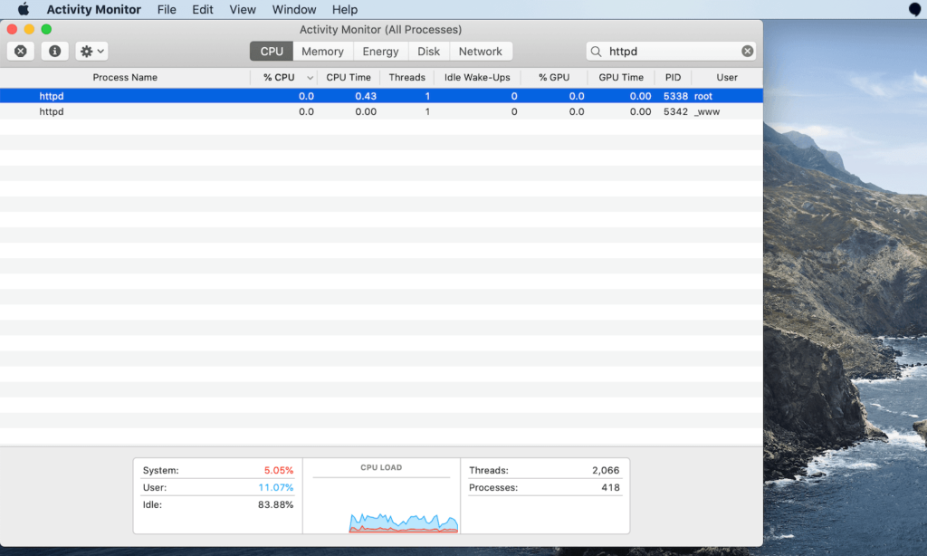 在Search 字段中,键入“httpd”。选择列表中的每个结果,然后单击 活动监视器左上角的停止图标: