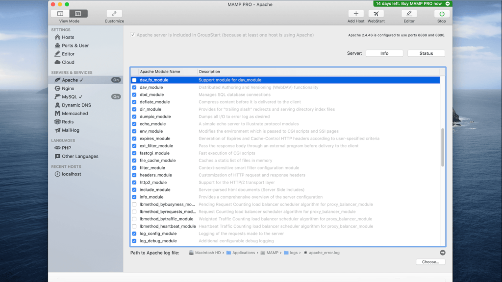 Apache是最常用的Web服务器之一。MAMP和MAMP Pro都提供此选项。但是,如果Apache服务器没有运行,您将很难连接到您的localhost。