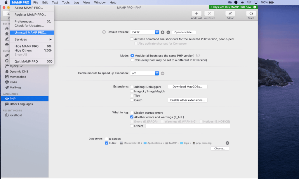 要卸载MAMP Pro,请选择MAMP PRO > Uninstall MAMP Pro。如果出现提示,请输入您的管理员用户名和密码: