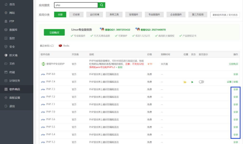 为此,请登录您的宝塔管理后台。导航到软件商店,搜索php,然后安装您需要的PHP版本: