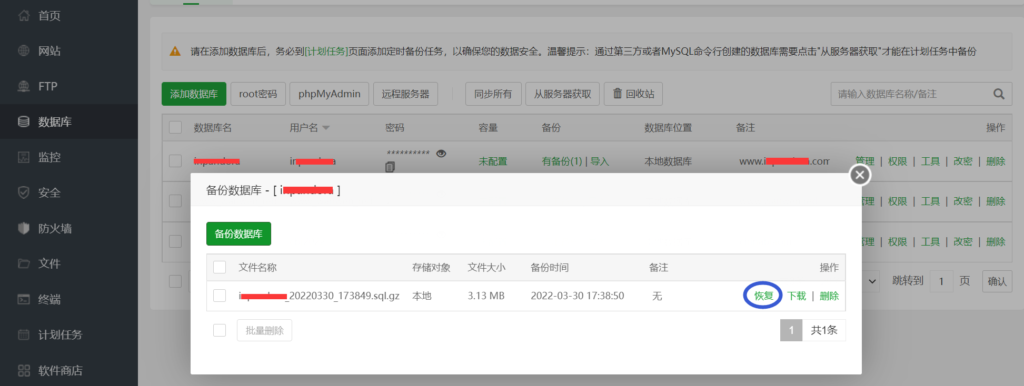 如果您选择继续,恢复备份的过程将根据您用于创建和存储文件的系统而有所不同。例如,宝塔客户可以利用我们的一键恢复过程。只需登录您的宝塔控制面板即可开始使用,然后单击数据库,找到网站对应数据库的备份栏,点击有备份,在弹窗中选择需要恢复的数据库即可:
