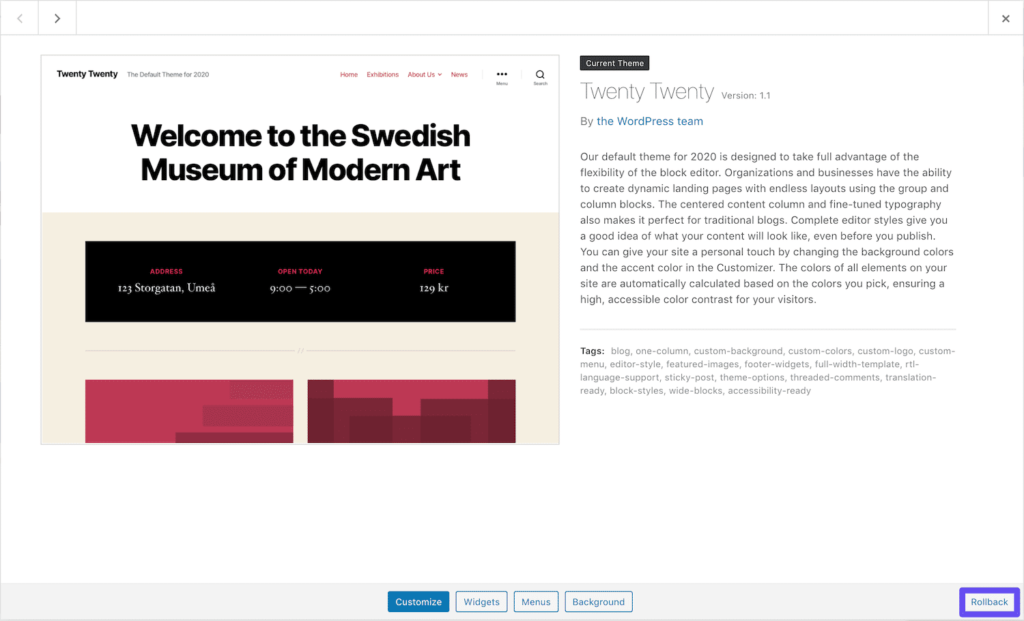 回滚主题同样容易。导航到仪表板中的外观 > 主题 ,然后选择要降级的主题。现在在窗口底部会有一个Rollback按钮: