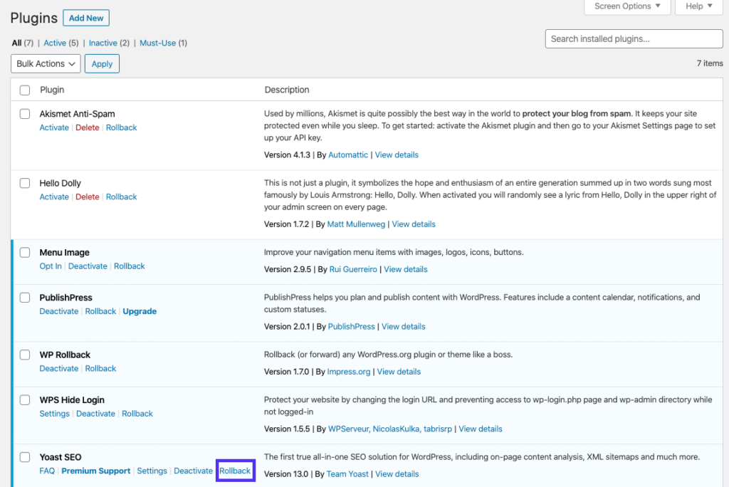如果两个插件之间或插件与您的主题之间发生冲突,降级WordPress本身将无济于事。相反,您需要回滚导致问题的插件或主题的版本,以便让您的网站重新启动并运行。