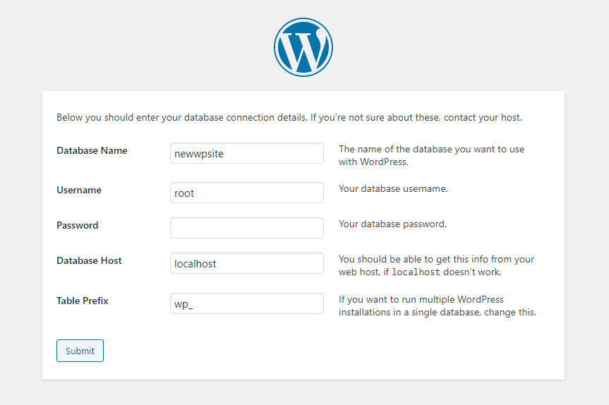 输入数据库名称、用户名和密码。你也可以定义你自己的表前缀,但现在,我保持默认值。完成后,点击’Submit’。