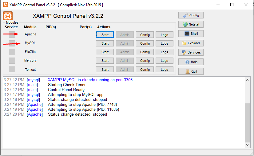 重要提示:确保XAMPP控制面板中的Apache和MySQL服务已经启动并运行。