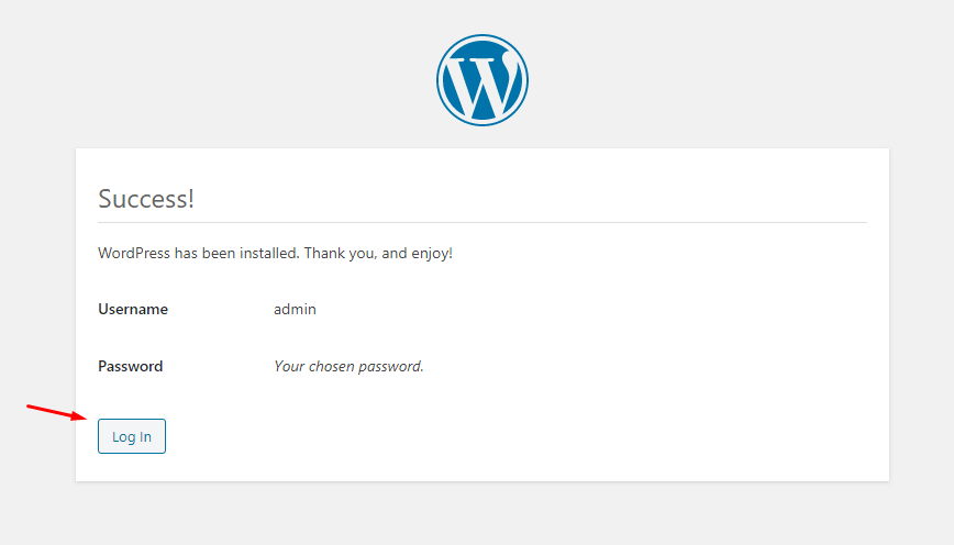 一旦完成,点击 “Install WordPress”按钮。这将显示成功信息和启动非常著名的WordPress仪表板登录页面的按钮。