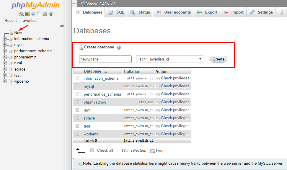接下来,访问phpMyAdmin门户,创建你的新WordPress网站的数据库。你很可能在以下网址找到该门户(取决于你的端口配置)。