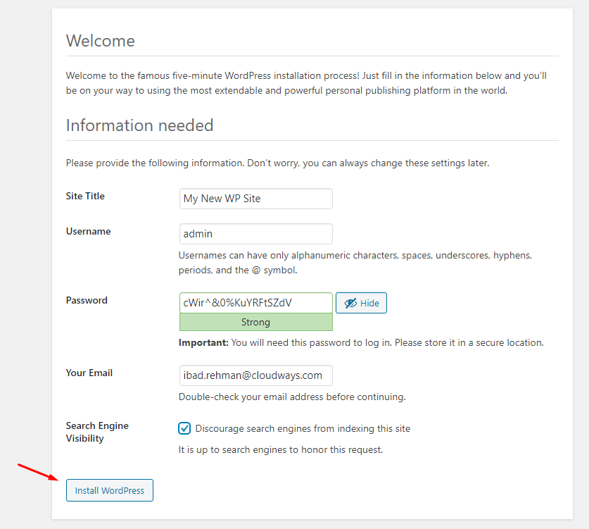 在下一个屏幕中,提供有关你的网站的信息,并设置用户名和密码以访问WordPress仪表板。